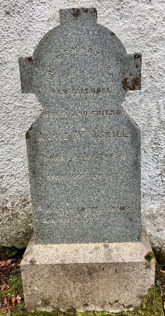 The phrase “God’s anger touched her, and she slept” was carved on the gravestone of Annie Macaskill. The full inscription on Annie’s headstone read,