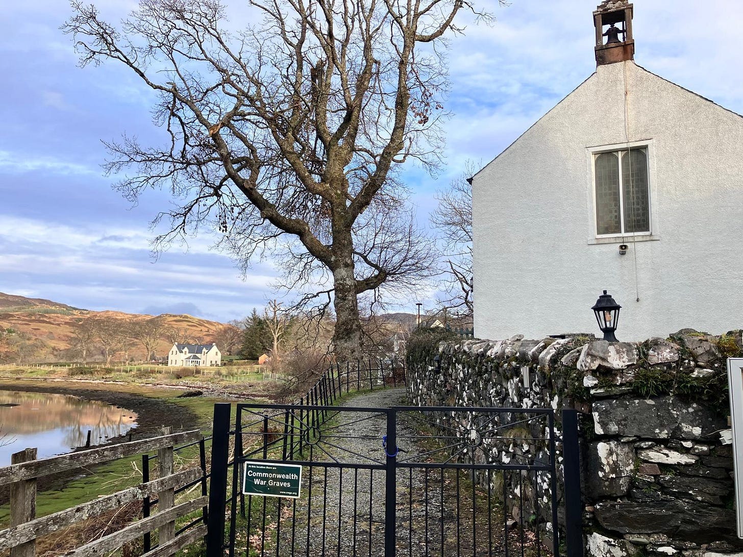 I visited the local churchyard and found many interesting graves, some Commonwealth war graves for those in the services who found their permanent rest back in Glenelg. That too is for another substack, as I want to go into more detail about the soldiers and sailors who had a grave. Also, those who were on family stones and who are buried or commemorated on Commonwealth War Graves memorials abroad. What I say is that the men of Glenelg served in every corner of the Great War, not just the more well-known battlefields of the Western Front of Northern France and Belgium. I will write about the outstanding Category A Memorial, which has the most picturesque location, on Substack. I have seen many memorials over the years – this one is simply beautiful, the actual sculpture is outstanding.